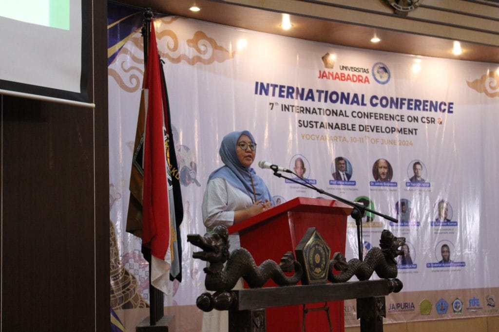 Selanjutnya Dr. Erni Ummi Hasanah SE MSI selaku ketua panitia, dalam sambutannya menyampaikan bahwa tema CSR dan Pembangunan Berkelanjutan dipilih karena semakin pentingnya peran perusahaan dalam mendukung pembangunan berkelanjutan dan tanggung jawab sosial yang semakin mendapat perhatian global. Lebih lanjut disampaikan “Konferensi ini berlangsung selama dua hari, dengan serangkaian kegiatan dan diikuti oleh sekitar 200 peserta dari Indonesia dan beberapa negara termasuk (India, Amerika, Kuwait, Vietnam, Malaysia) secara offline. Beberapa negara mengikuti secara online yaitu Swedia, Uzbekistan, Sri Lanka, Ethiopia dan Georgia. Peserta yang hadir terdiri dari akademisi, perwakilan perusahaan, LSM dan pejabat pemerintah. Kami juga memberikan penghargaan (SERD Sustainability Award 2024) kepada beberapa perusahaan dan individu yang telah menunjukkan komitmen luar biasa di bidang CSR†pungkas Erni.