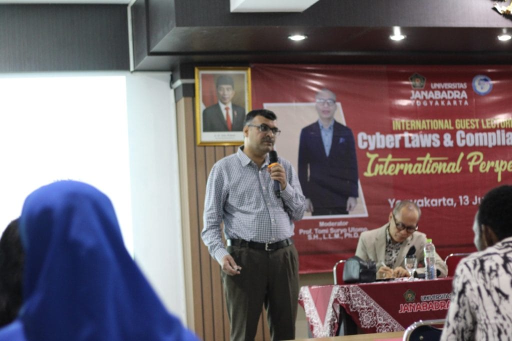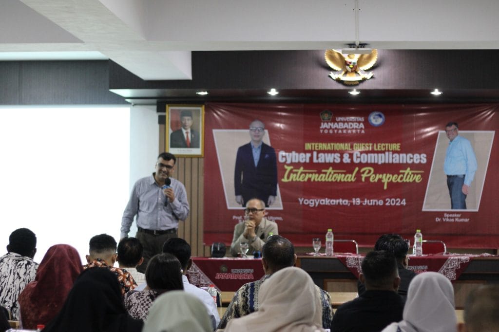 Sedangkan untuk mahasiswa dan dosen jurusan Hukum (FH-UJB), dalam gues lecture kali ini menghadirkan pembicara Prof Vikas Kumar President of Society for Education and Research Development (SERD), yang juga berasal dari Central University of Haryana India dengan tema “Cyber Law & Complainces, International Perspektif. Rangkaian kuliah dosen tamu ini dipandu oleh Prof Tomi Suryo Kusumo SH LLM PhD dosen Fakultas Hukum Universitas Janabadra Yogyakarta. Kegiatan kuliah dosen tamu ini berlangsung Kamis (13/06/2024) di Ruang I.4 Kampus Fakultas Hukum Jalan Timoho II No. 40 Yogyakarta.