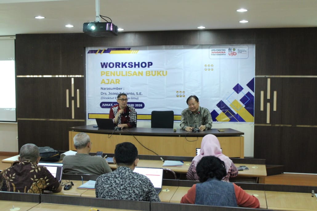 Fakultas Teknik Universitas Janabadra Yogyakarta menyelenggarakan Workshop Penulisan Buku Ajar sebagai bagian dari upaya peningkatan kualitas akademik dan penguatan budaya literasi dosen. Kegiatan ini dilaksanakan pada Jumat, 13 Februari 2026, mulai pukul 12.30 WIB, bertempat di Ruang Eksekutif Universitas Janabadra Yogyakarta.